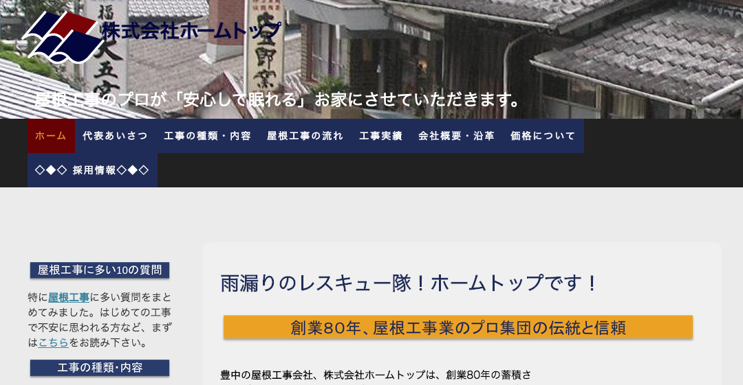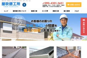 大阪府池田市での雨漏り修理にも対応。建築板金一筋の業者。社長の名前は屋吹さんという名前。まさに屋根のために生まれてきたような方です。社員は2名と小規模ですが、親身になり、地元に根付いた業者となっています。大阪府池田市で雨漏りのトラブルが起きたらサポートしてくれるでしょう。