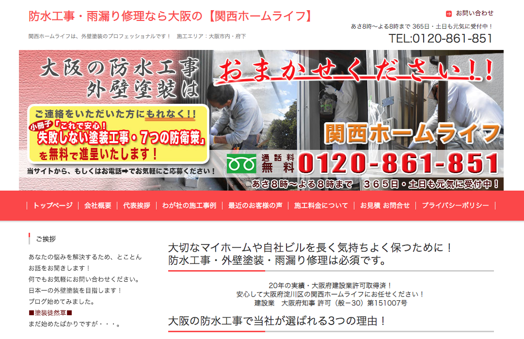 大阪市豊中市での雨漏り修理にも対応。地域に根付いた小さな会社。お金をかけずに時間をかけるをモットーにお客様の悩みを聞き納得した上で施工が始まります。職人さんのプロフィールもホームページで公開されています。